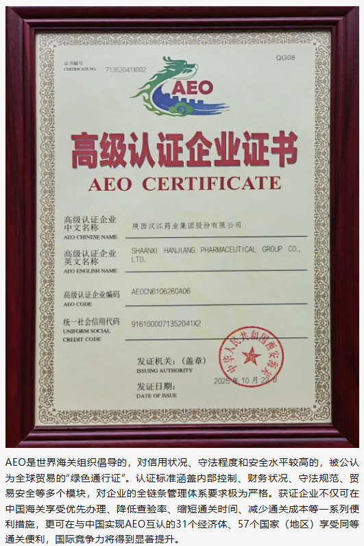 西安海關(guān)黨委委員、副關(guān)長吳偉棟代表海關(guān)系統(tǒng),向漢江藥業(yè)成功獲得 AEO 高級認證表示祝賀。他指出,AEO 高級認證是中國海關(guān)授予進出口企業(yè)的最高信用等級,是全球貿(mào)易公認的 “綠色通行證”,其嚴苛的認證標準涵蓋內(nèi)部控制、財務(wù)狀況、守法規(guī)范、貿(mào)易安全等多個核心模塊,漢江藥業(yè)的成功獲批,充分彰顯了企業(yè)在合規(guī)管理、全球運營等方面的過硬實力。西安海關(guān)將持續(xù)秉持 “精準服務(wù)、高效監(jiān)管” 的理念,為認證企業(yè)提供更多便利支持,助力企業(yè)在國際市場上大展拳腳。